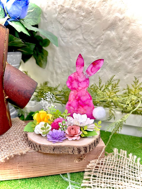 プラ板で作ったウサギにアルコールインクや色紙(いろがみ)を使用して装飾を行います。