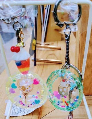 丸いクリアケースの中にお好きなシールやパーツを入れたキーホルダーとクリームソーダのチャームを作ります。