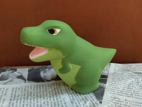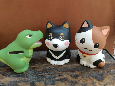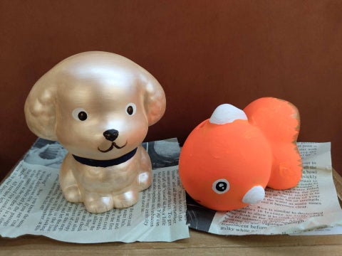 素焼きの動物や恐竜の貯金箱にアクリル絵の具を使って色を付け、オリジナルの貯金箱を作ります。