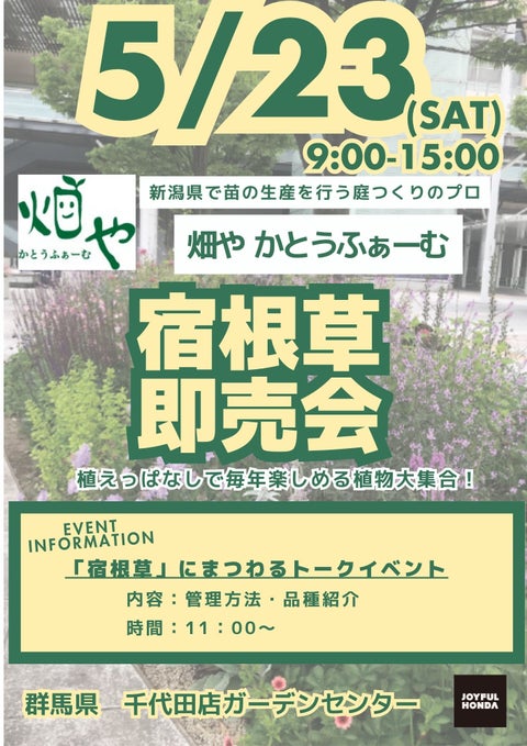 畑や かとうふぁーむさんをお招きしてのイベントです。11時~宿根草の管理説明・品種紹介もございます。ご参加お待ちしております。