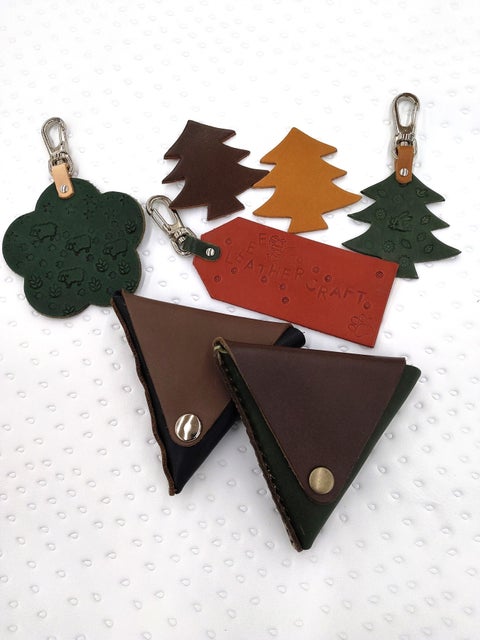 レザーチャームに刻印で模様を付ける体験をします!また、三角のコインケースの製作体験も可能です!