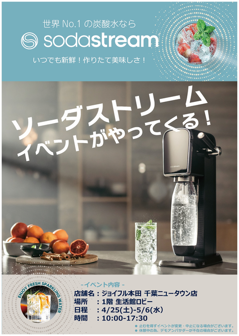 お家でいつでも炭酸水が作れるソーダストリームの飲み比べができる。できたて炭酸水やジュースが試せる体験会です。期間限定でお得なものもありますのでぜひお越しください✨