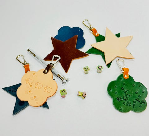 カシメで作るサンカクケース・カードケースと刻印で楽しむチャームをご用意しています。