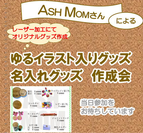 ASH MOMさんによるゆるイラスト入りグッズ・名入れグッズ作成会を開催致します。